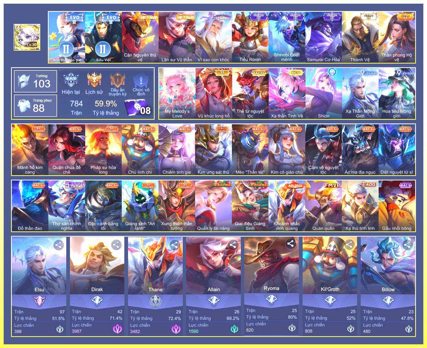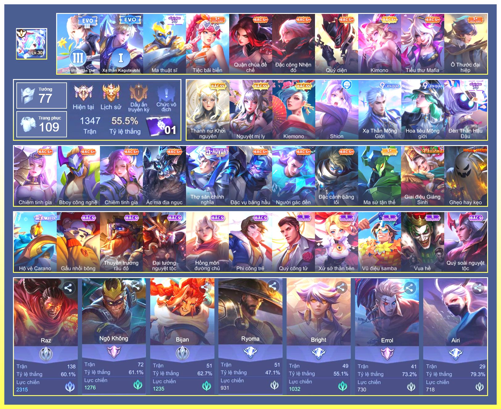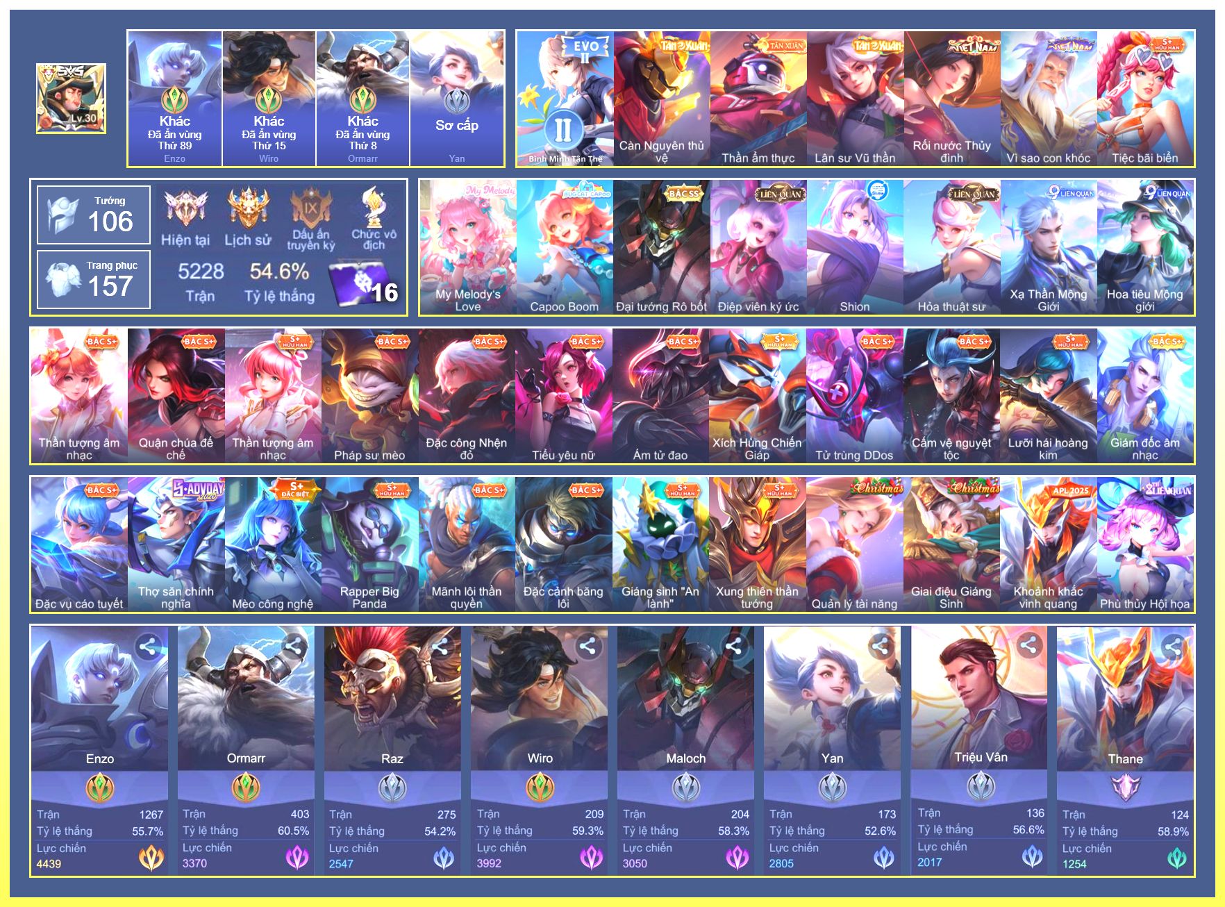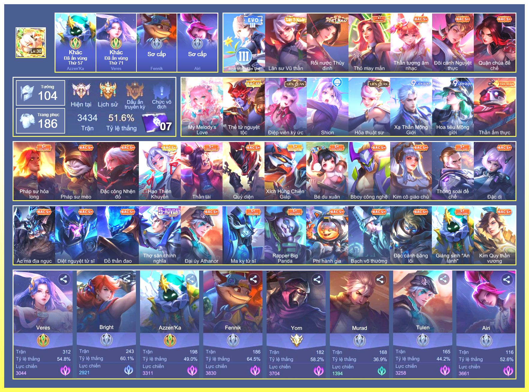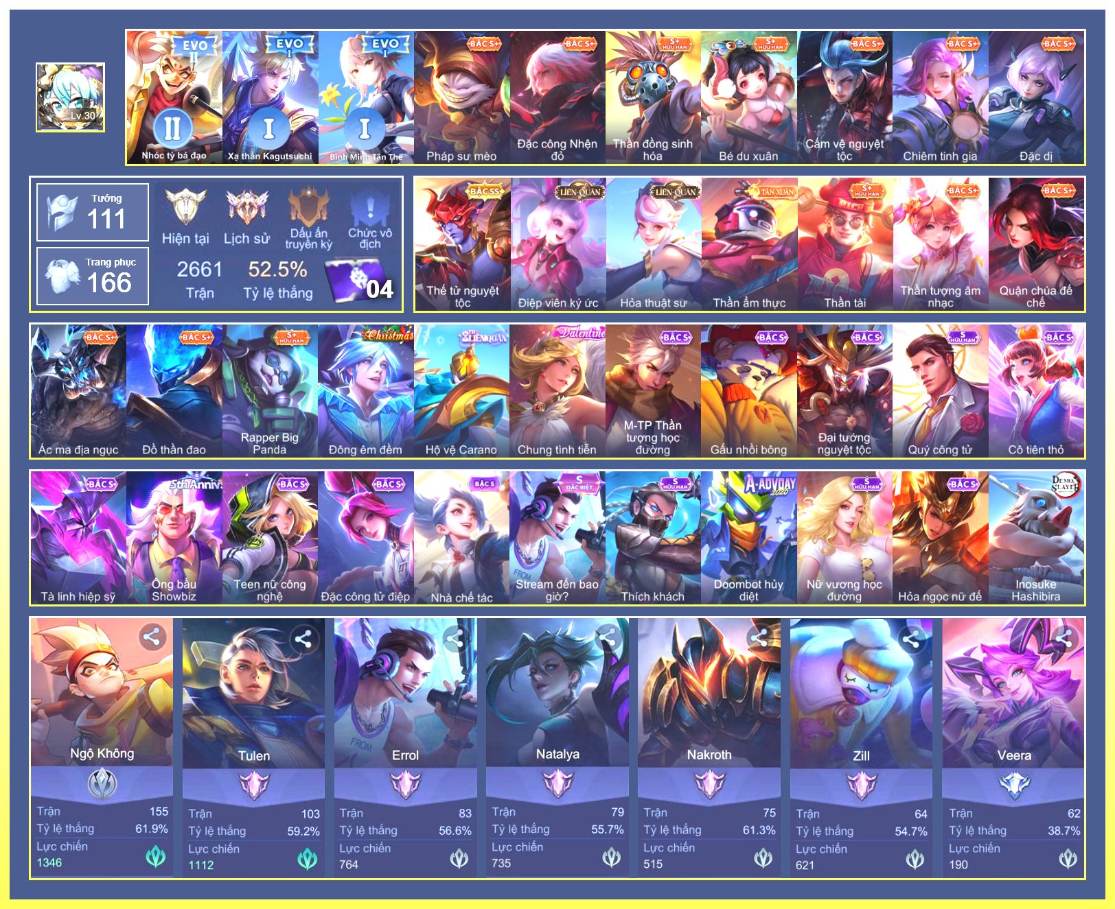 Nổi bật: Rất Nhiều Skin Đẹp Vip.Ngọc 90.Dư 4 Đá Quý.Tel Annas Vũ Khúc Yêu Hồ.Murad Siêu Việt.Flo Giám Sát Tinh Hệ.Nak AIC.Ngộ Không Ngộ Khá Trẩu.Slimz Siêu Cấp Tối Thượng....