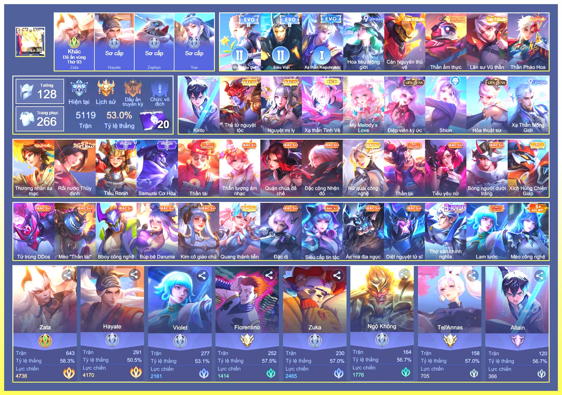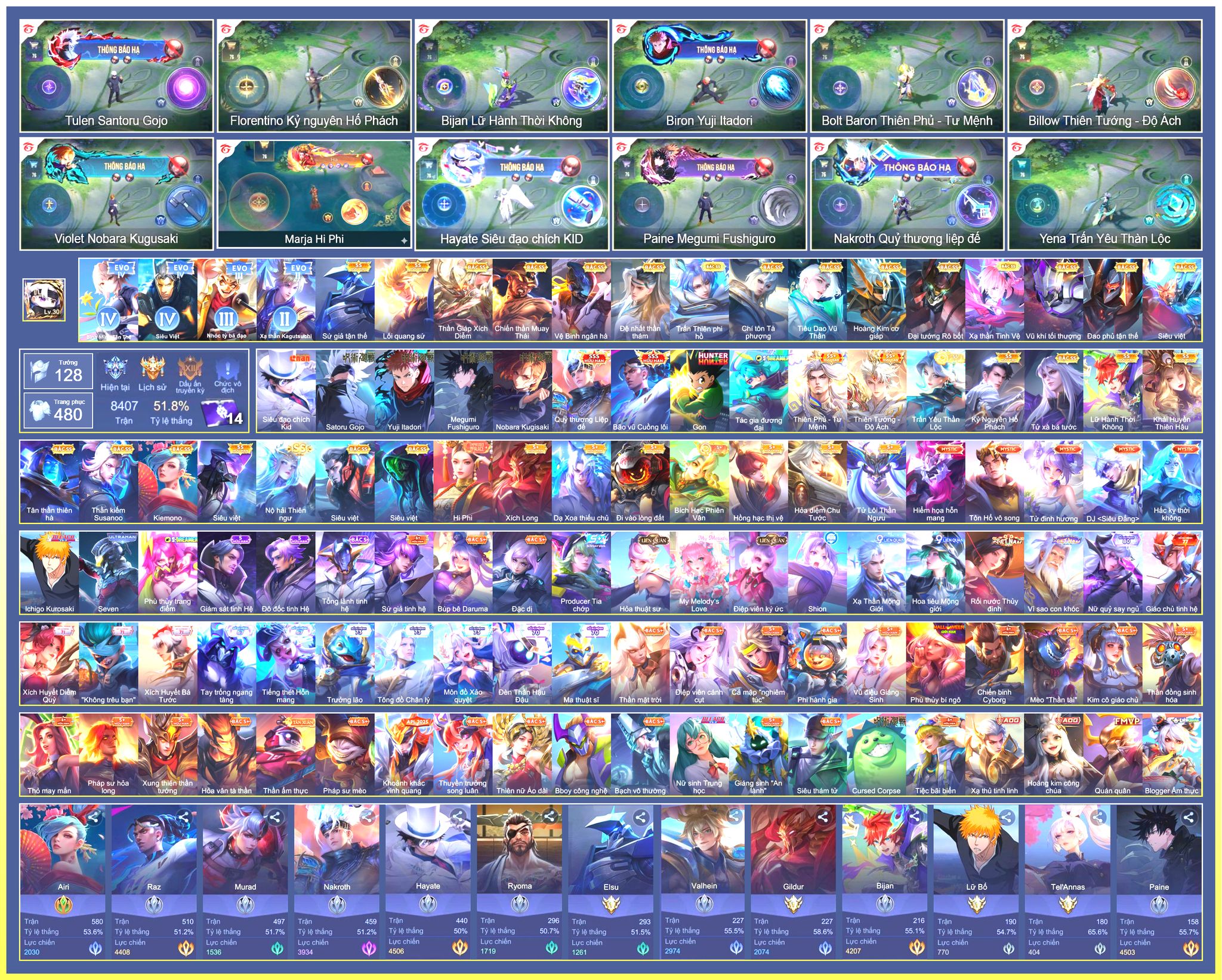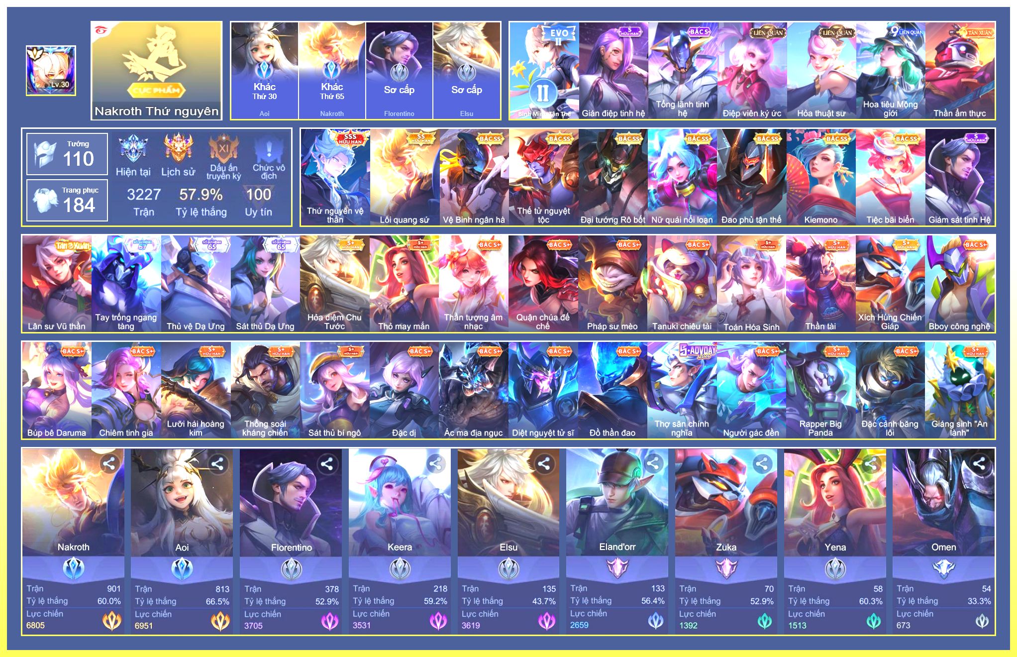 Nổi bật: Rất Nhiều Skin Đẹp Vip.Ngọc 90.Dư 103K Vàng.Dư 2 Đá Quý.Arum Vũ Khúc Long Hổ.Laville Xạ Thần Tinh Vệ.Yorn Thế Tử Nguyệt Tộc.Nak Siêu Việt.Butterfly Bình Minh Tận Thế.Nak Quán Quân.Elsu Xạ Thủ Linh Tinh.Hayate Mãnh Hổ Kim Cang.Wisp Tiểu Ronin.Omega Samurai Cơ Hoá.Enzo Shinobi Đoạt Mệnh....