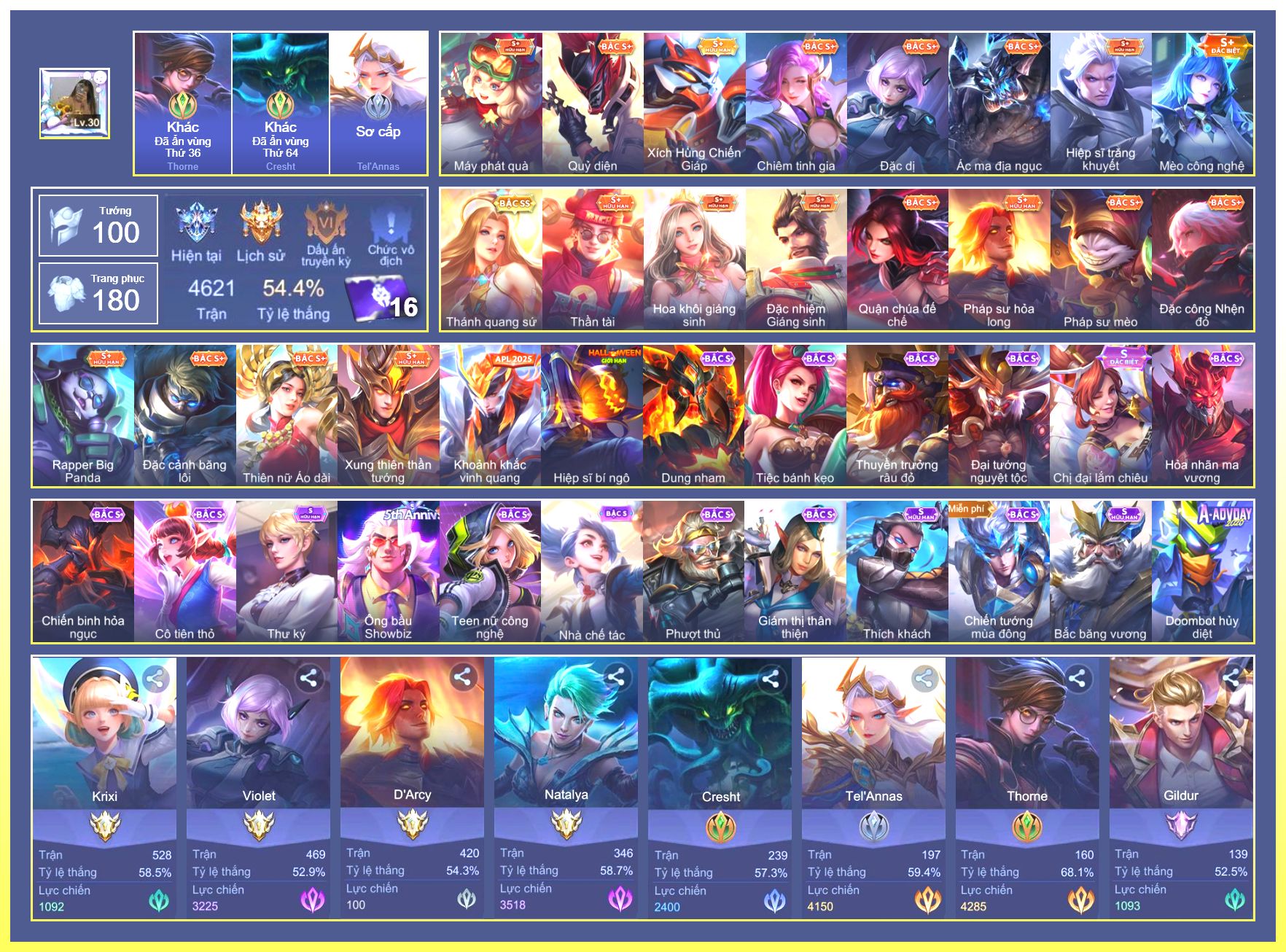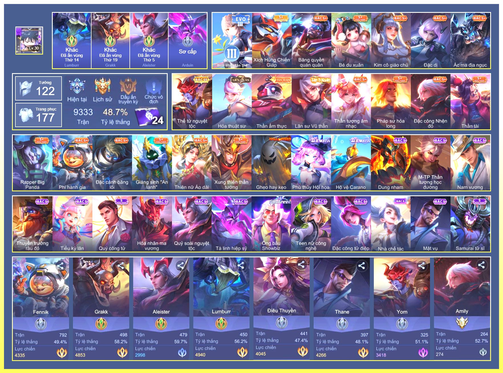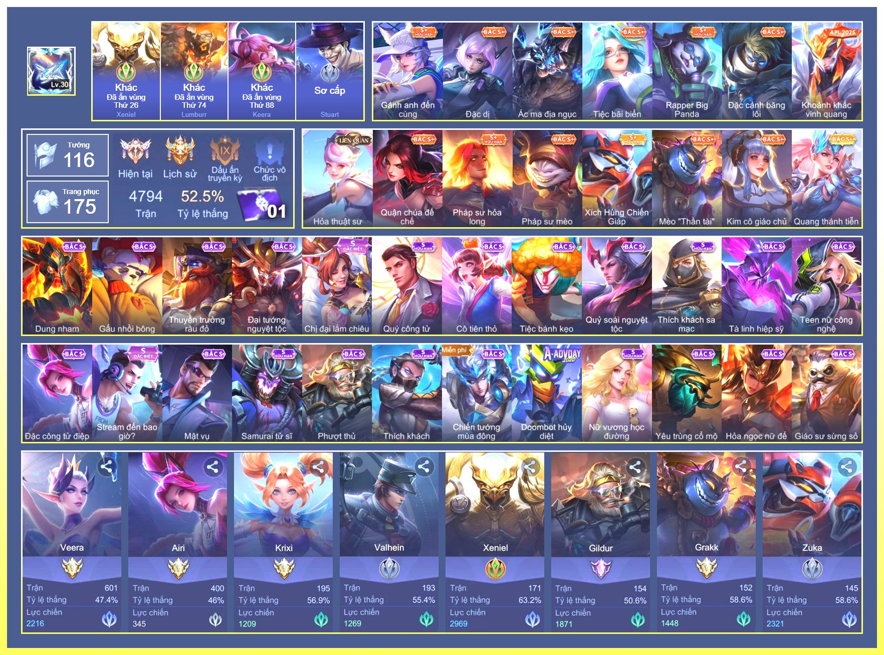 Nổi bật: Rất Nhiều Skin Đẹp Vip.Ngọc 90.Flo Giám Sát Tinh Hệ.Ngộ Không Đặc Vụ Băng Hầu.Flo Tà Long Kiếm Sĩ.Slimz Siêu Cấp Tối Thượng.Zuka Gấu Nhồi Bông....