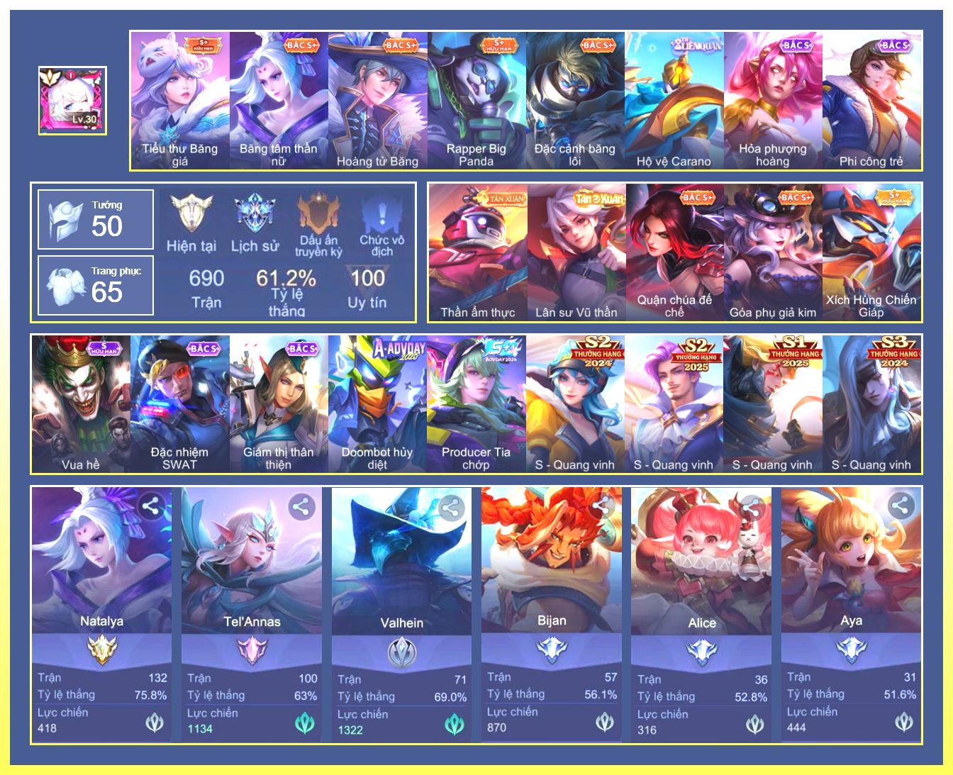 Nổi bật: Rất Nhiều Skin Đẹp Vip.Ngọc 90.Dư 11 Đá Quý.Airi Bạch Kiemono.Valhein Vũ Khí Tối Thượng.Krixi Tiệc Bãi Biển.Valhein Xạ Thần.Butterfly Bình Minh Tận Thế.Ngộ Không Đặc Vụ Băng Hầu....