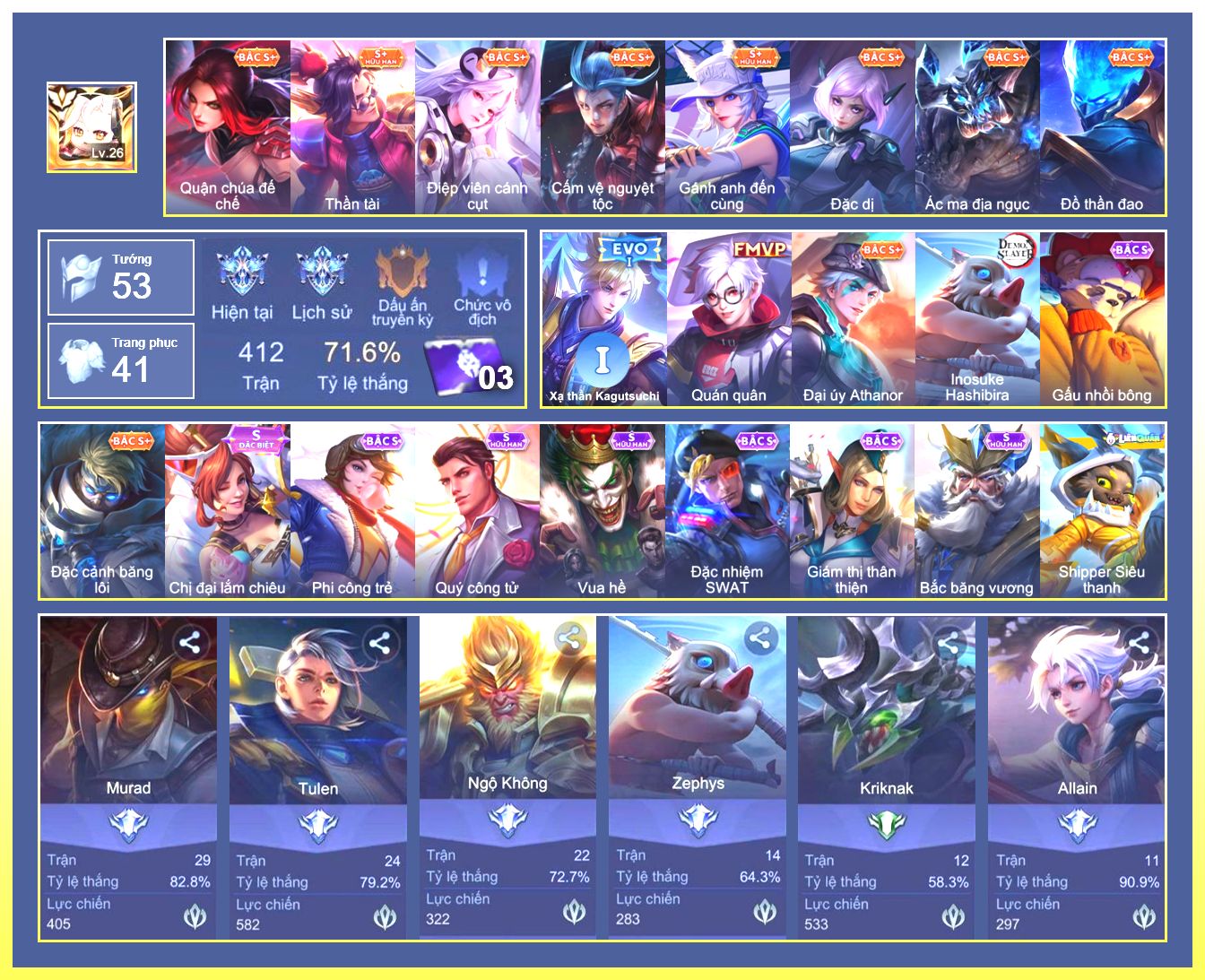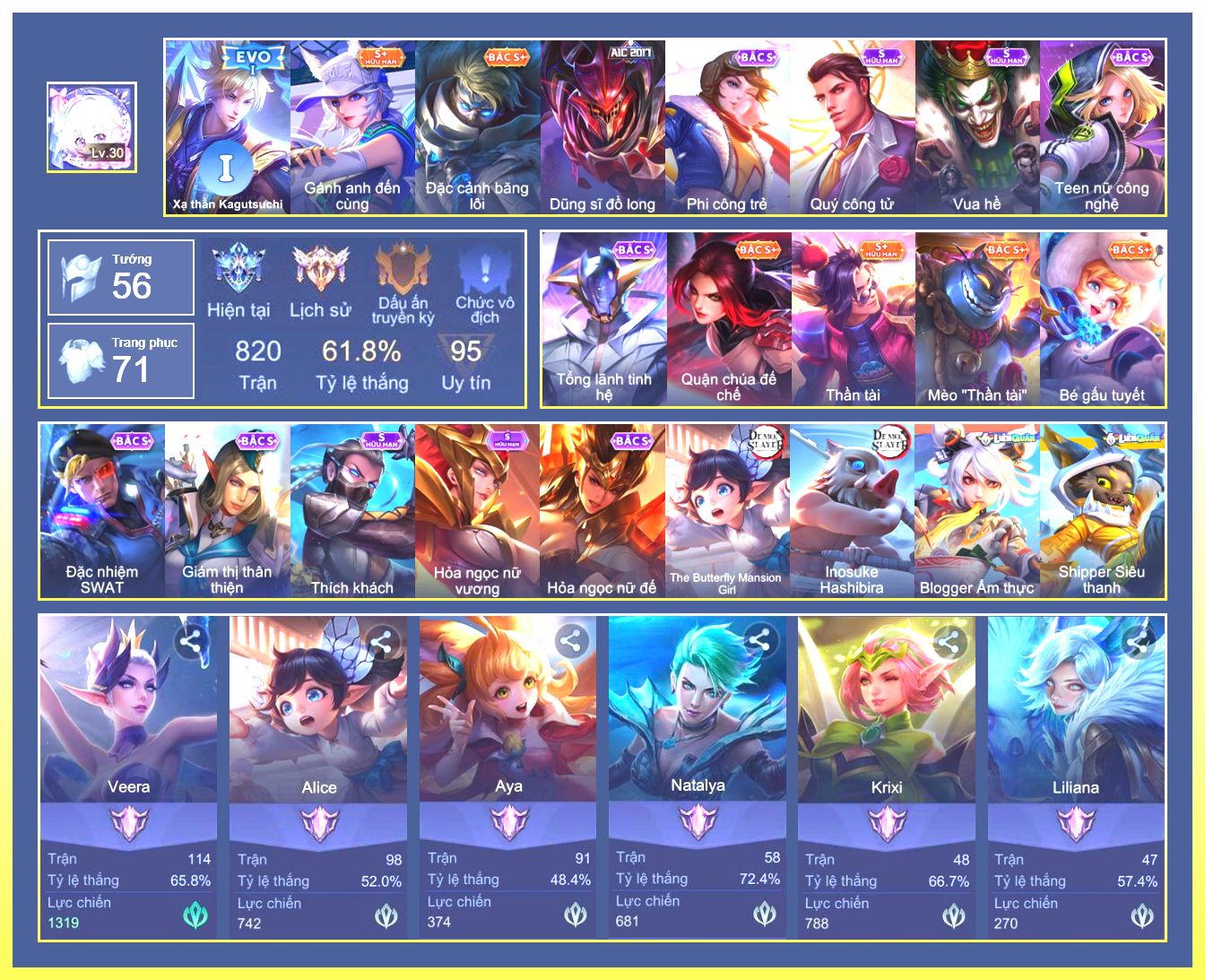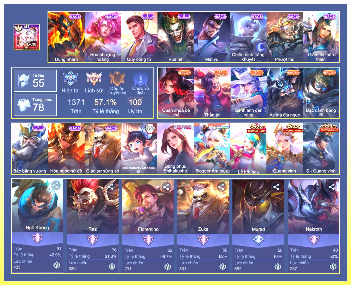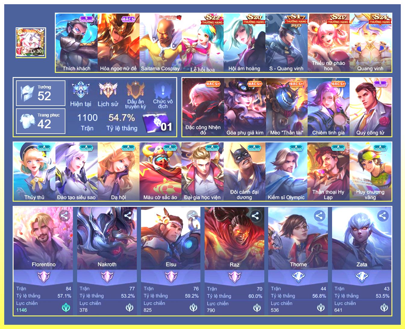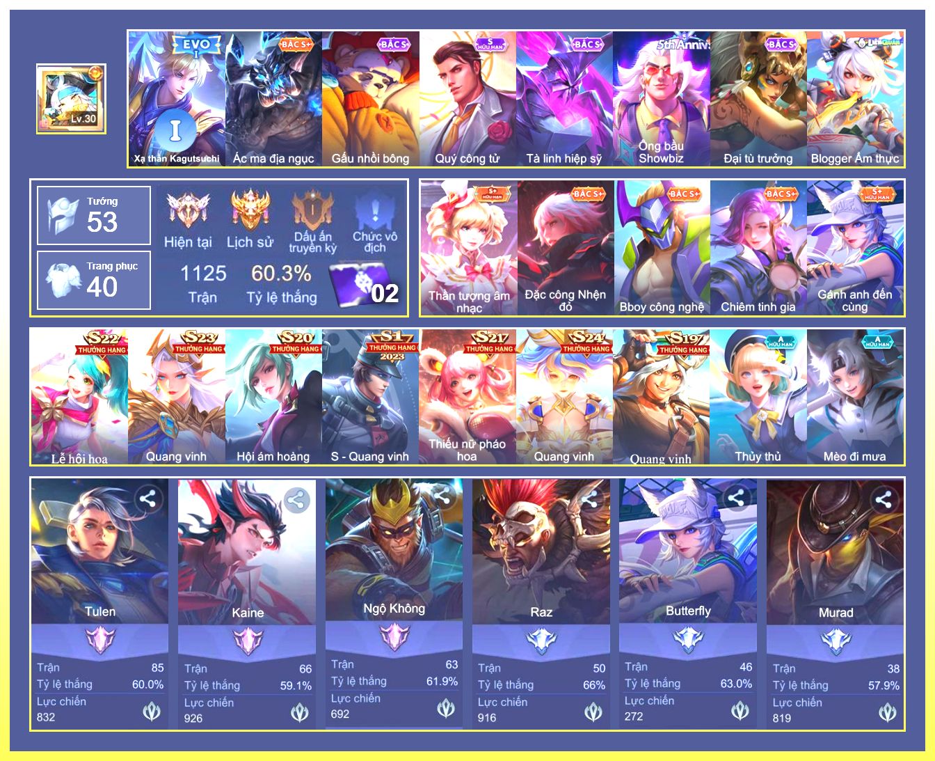 Nổi bật: Rất Nhiều Skin Đẹp Vip.Ngọc 90.Tulen Tân Niên Vệ Thần.Điêu Thuyền Tiệc Bãi Biển.Valhein Xạ Thần.Nak Bboy Công Nghệ.Zuka Gấu Nhồi Bông.Qi Quán Quân....